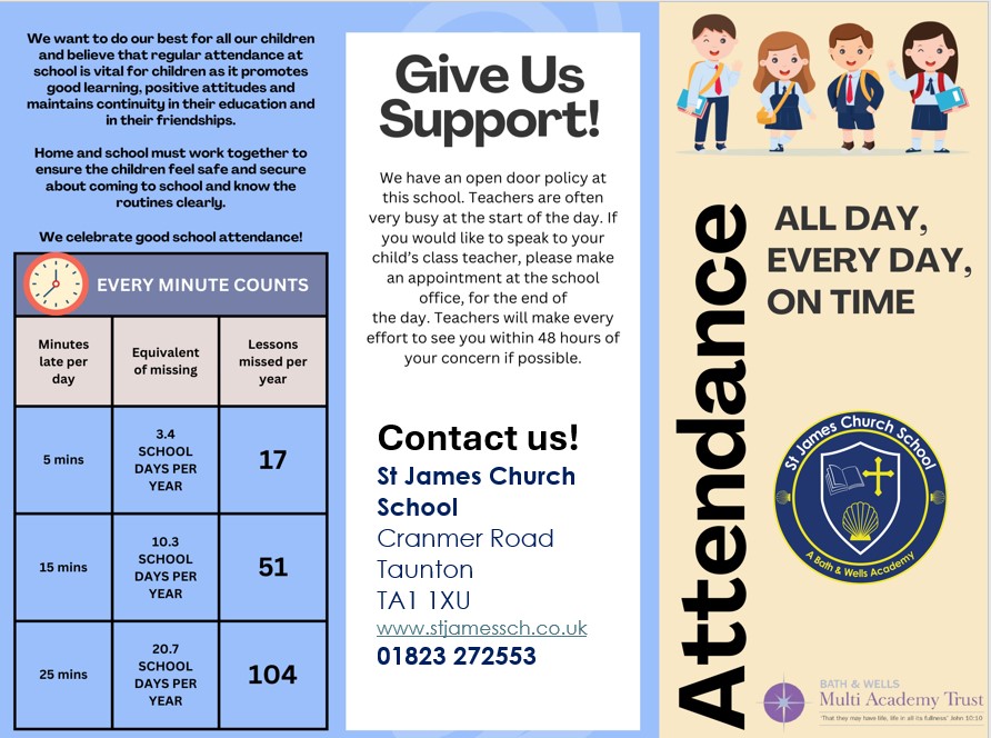 Our main aim is to support excellent levels of attendance for all children to enable fulfilment of their potential at St James Church School