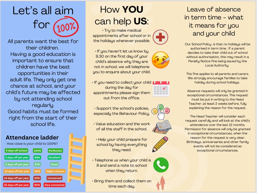 The education of our children is of the utmost importance to us - to enable every child to achieve their best, they have to be in school. Attendance is very closely monitored. We want all children to have an attendance percentage of 97 or above.