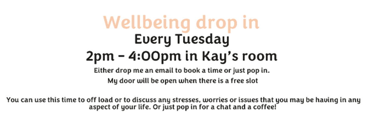 - Weekly confidential drop in for Wellbeing for all staff with trained counsellor.